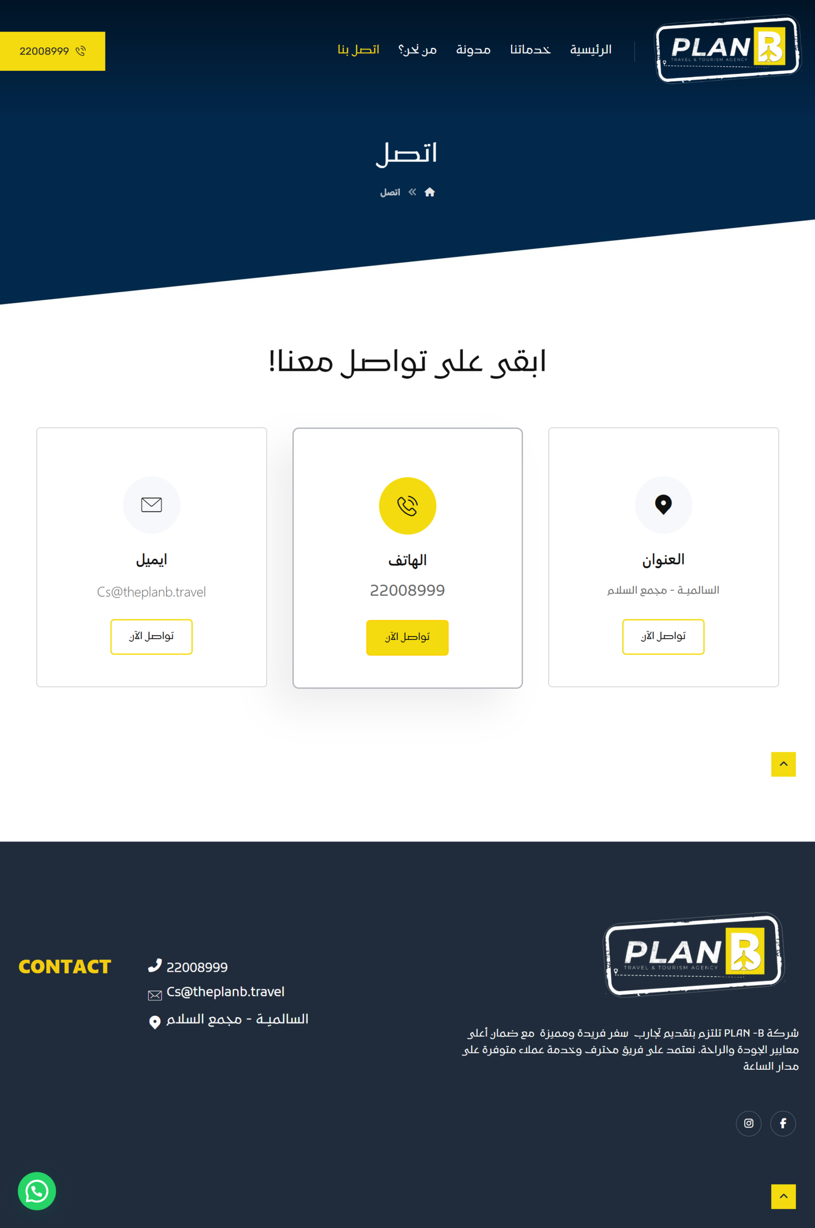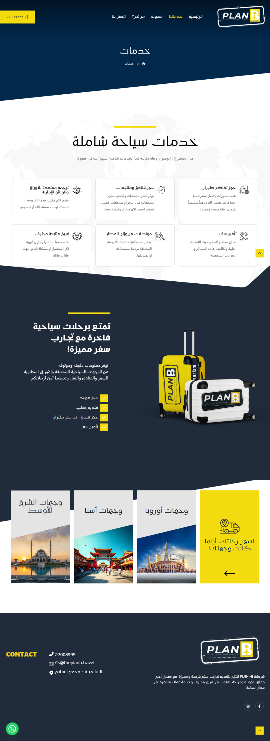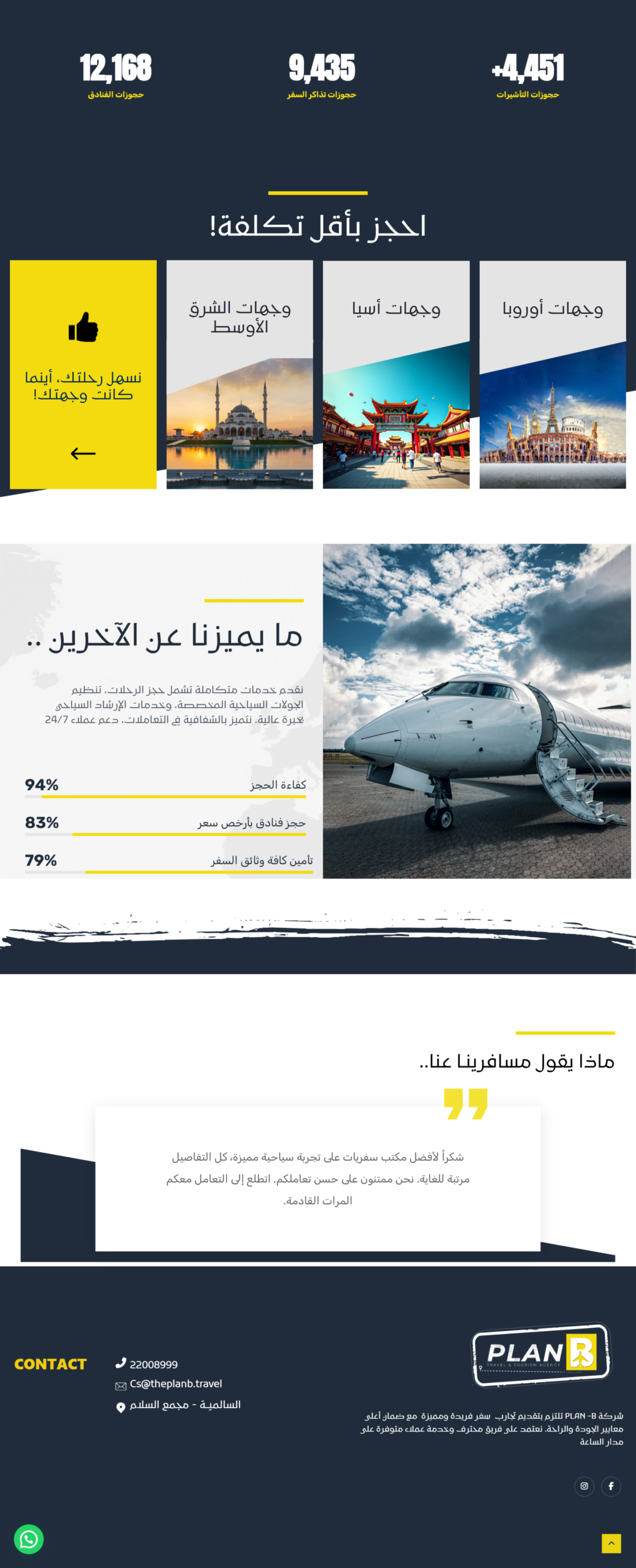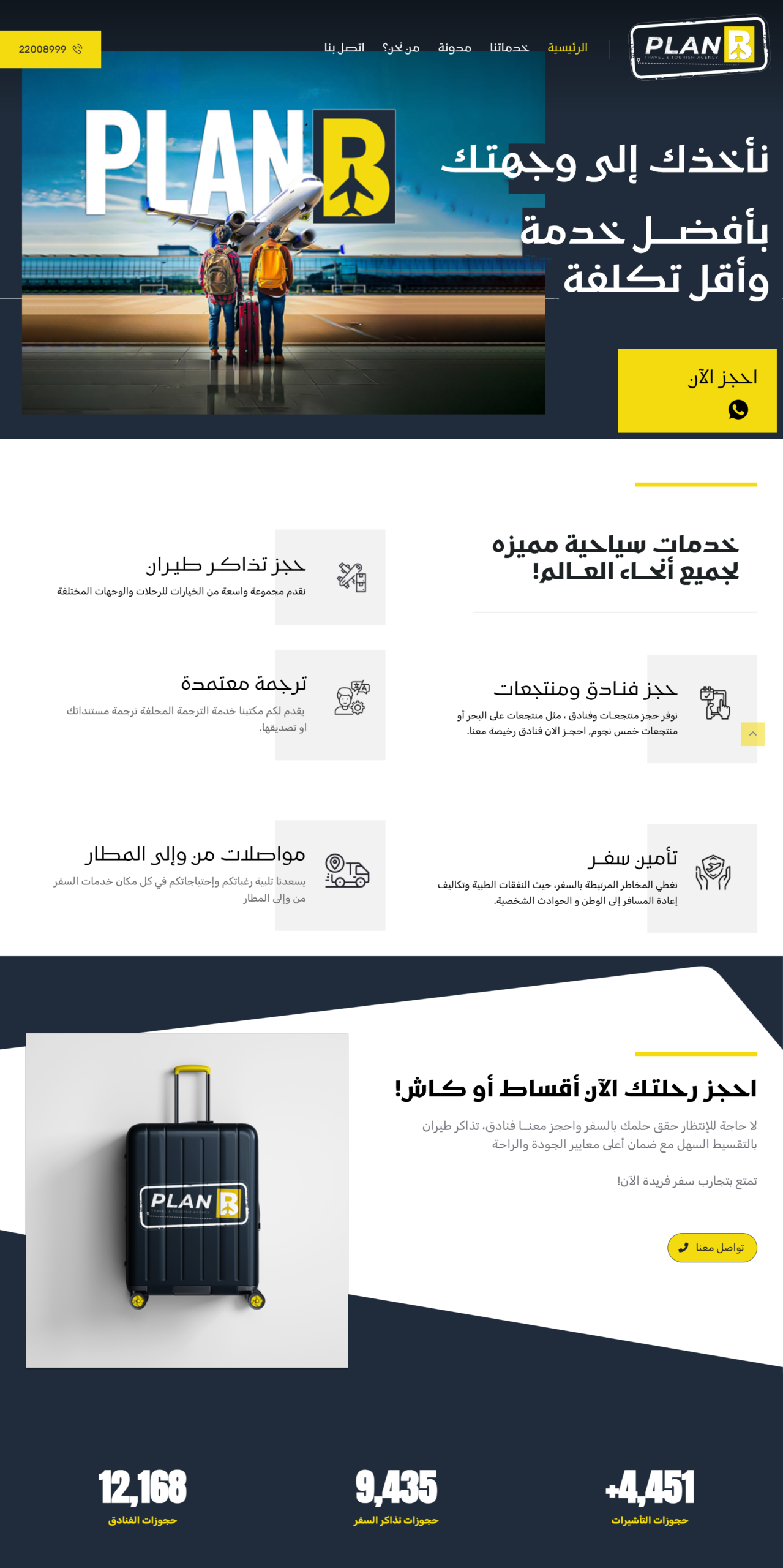 نفذت كريتيف تصميم وتطوير الموقع الإلكتروني لشركة “Plan B” للسياحة والسفر في الكويت، بموقع سريع، متجاوب على جميع الأجهزة، سهل الاستخدام، ومبني وفق معايير SEO قوية لتعزيز الظهور في محركات البحث.
